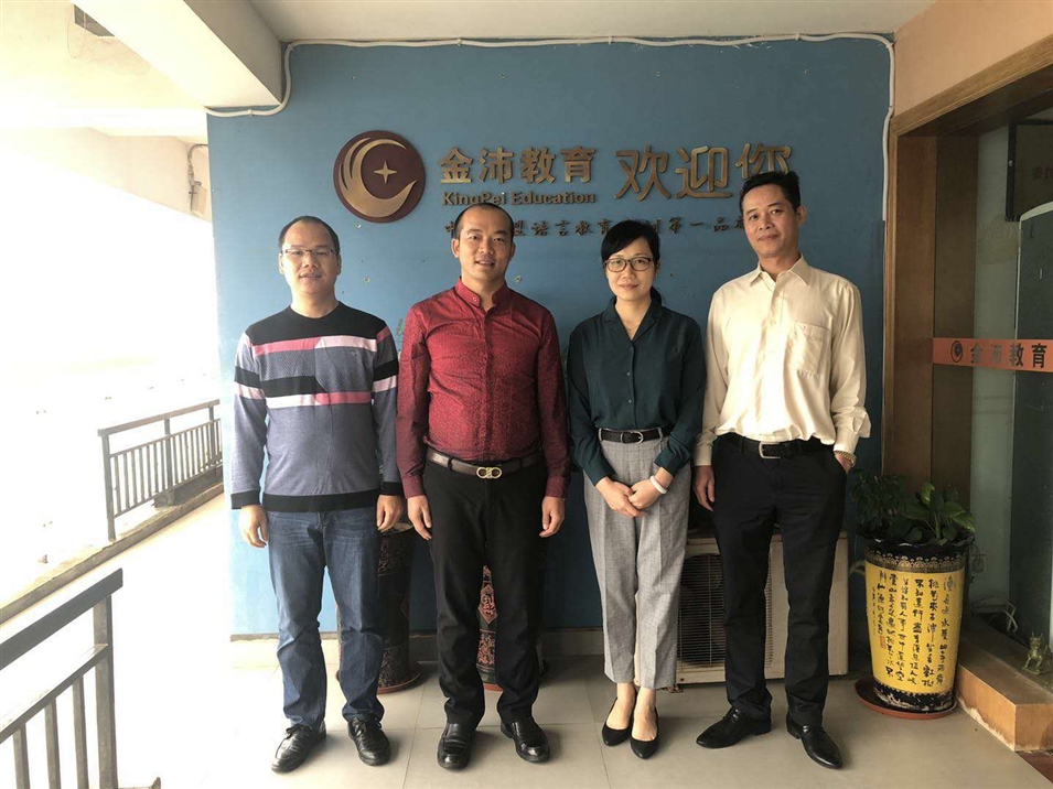 廣西金沛教育執(zhí)行董事粟宥朝左二)、國際部合伙人許顯鋒左一與廣西國際文化交流中心副秘書長羅琨(右二)、經濟科技部部長吳偉(右一)一行合影留念