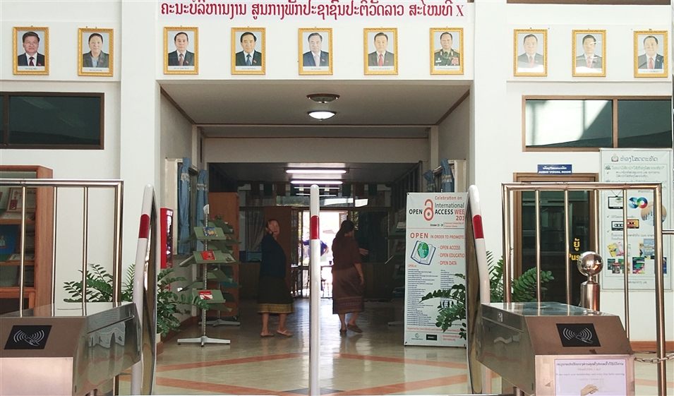 正對著圖書館入口處的墻上掛著一排相框,展示的是本屆老撾人民民主共和國中央領(lǐng)導(dǎo)的照片。