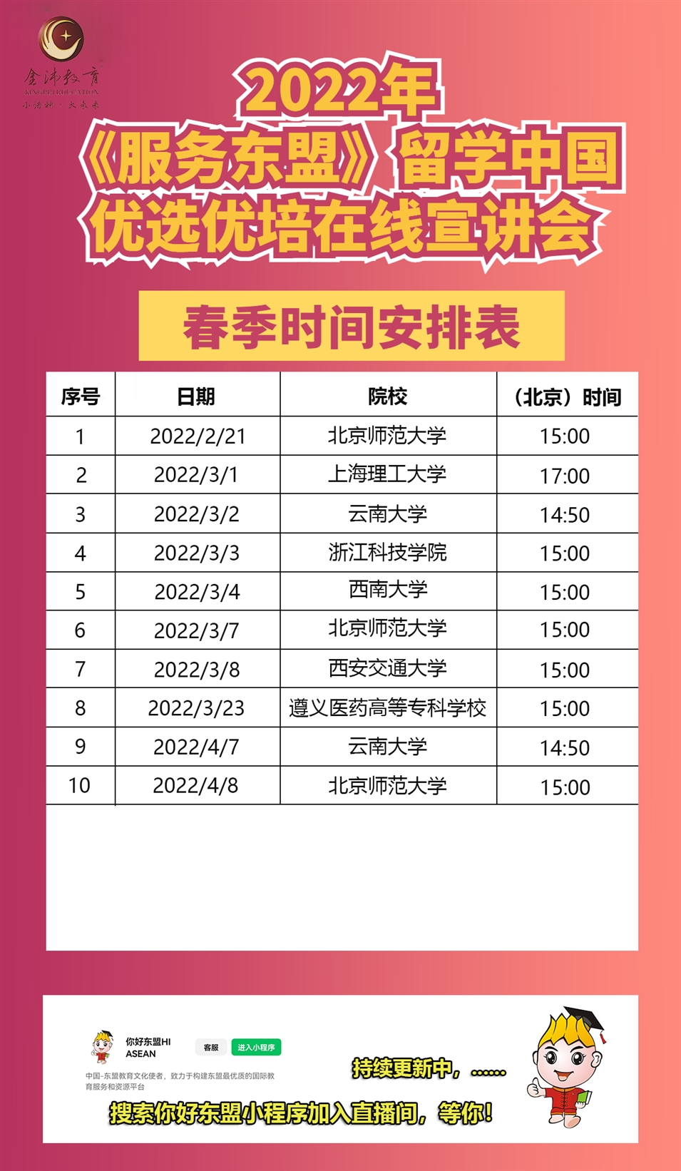 2022年2月21日起由我司聯(lián)合多所高校開展的“2022年春季留學(xué)中國(guó)優(yōu)選優(yōu)培線上直播宣講會(huì)”將在“你好東盟”微信小程序上進(jìn)行開播。