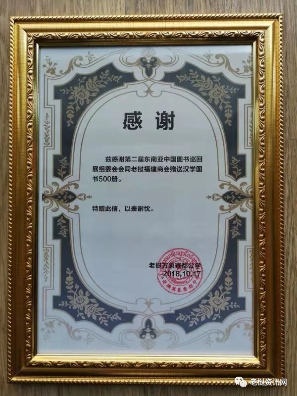 贈(zèng)書活動(dòng)儀式安排在學(xué)校會(huì)議室舉行,寮都公學(xué)董事長(zhǎng)林俊雄從老撾福建商會(huì)代表們手中接過由第二屆東南亞中國(guó)圖書巡回展組及老撾福建商會(huì)共同向竂都公學(xué)捐贈(zèng)的價(jià)值近3萬元的圖書。據(jù)介紹,本次捐贈(zèng)圖書內(nèi)容涵蓋中國(guó)傳統(tǒng)文化、經(jīng)典文學(xué)、漢語(yǔ)學(xué)習(xí)為主等各類圖書500冊(cè)。交接儀式結(jié)束完畢后,林俊雄董事長(zhǎng)當(dāng)場(chǎng)向老撾福建商會(huì)代表頒發(fā)了受贈(zèng)感謝狀。