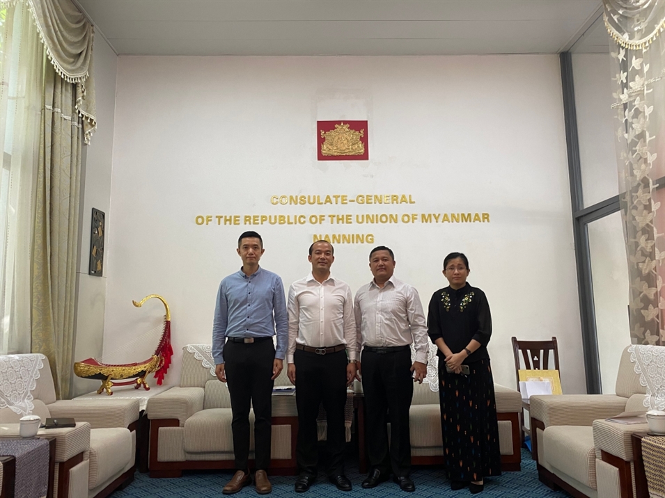 (左一國際部主任陸士偉先生、左二廣西金沛教育執(zhí)行董事粟宥朝先生、右二緬甸聯(lián)邦共和國駐南寧總領(lǐng)事梭岱南先生 合影留念)