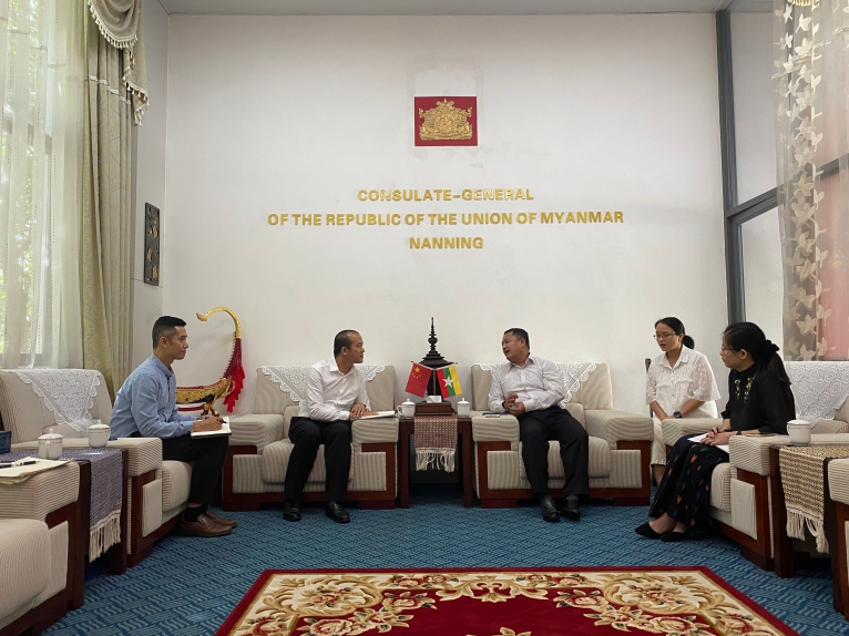 2020年9月9日下午,廣西金沛教育執(zhí)行董事粟宥朝、國際部主任陸士偉、新媒體中心韋清清一行拜訪了緬甸聯(lián)邦共和國駐南寧總領(lǐng)事館,總領(lǐng)事梭岱南熱情接見了我司的到訪,并就“關(guān)于中緬兩國教育交流與合作”展開了探討。