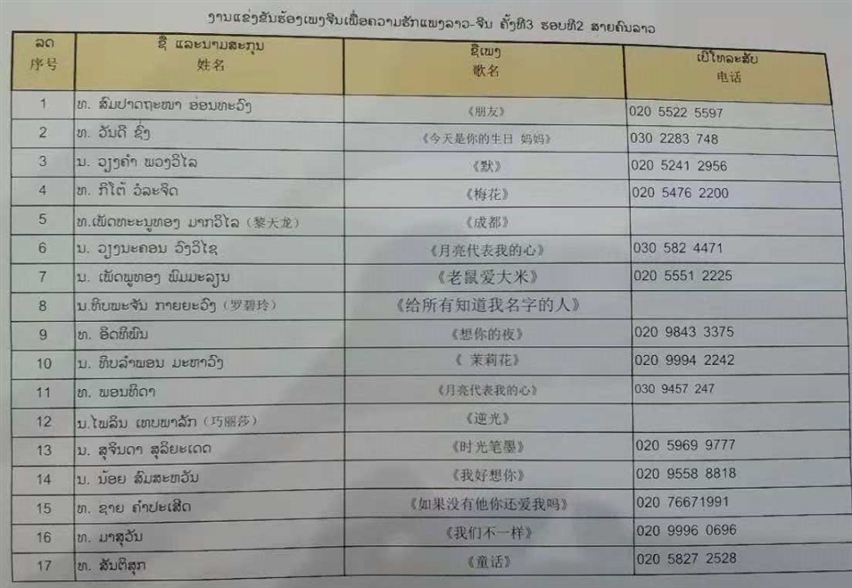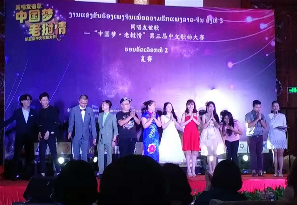 由中國駐老撾大使館和老撾新聞文化旅游部指導,中國國際廣播電臺老撾分臺、老撾國立大學孔子學院和中國廣西電視臺共同主辦的“中國夢·老撾情”第三屆中文歌曲復賽于10月28日在東昌酒店二樓B廳進行,經過初賽的角逐,本輪進入復賽的30名選手分別登臺獻唱,最終10名選手脫穎而出,進入決賽。